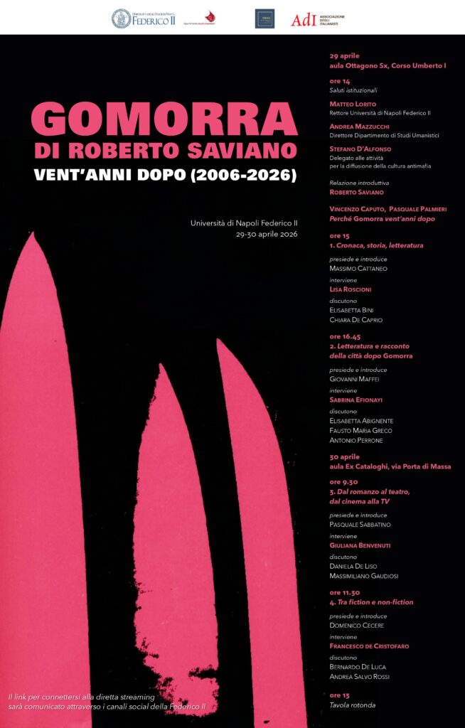 Si terrà il 29 aprile 2026 a partire dalle 14.00 (aula Ottagono sx dell’Edificio centrale a corso Umbero I) e il 30 aprile 2026 a partire dalle ore 9.30 (aula ex cataloghi lignei di via Porta di Massa 1) il Convegno di Studi “Gomorra” di Roberto Saviano vent’anni dopo (2006-2026) al quale parteciperanno studiose e studiosi dell’Ateneo federiciano, della Sapienza Università di Roma e dell’Università di Bologna Alma Mater Studiorum. Si tratta di un incontro interdisciplinare che intende sondare da prospettive diverse l’impatto che nell’ultimo ventennio il romanzo-inchiesta di Roberto Saviano ha avuto sulla cultura italiana (a discutere saranno infatti docenti di storia, di filologia, di linguistica, di cinema, di letteratura italiana, contemporanea e di letterature comparate).