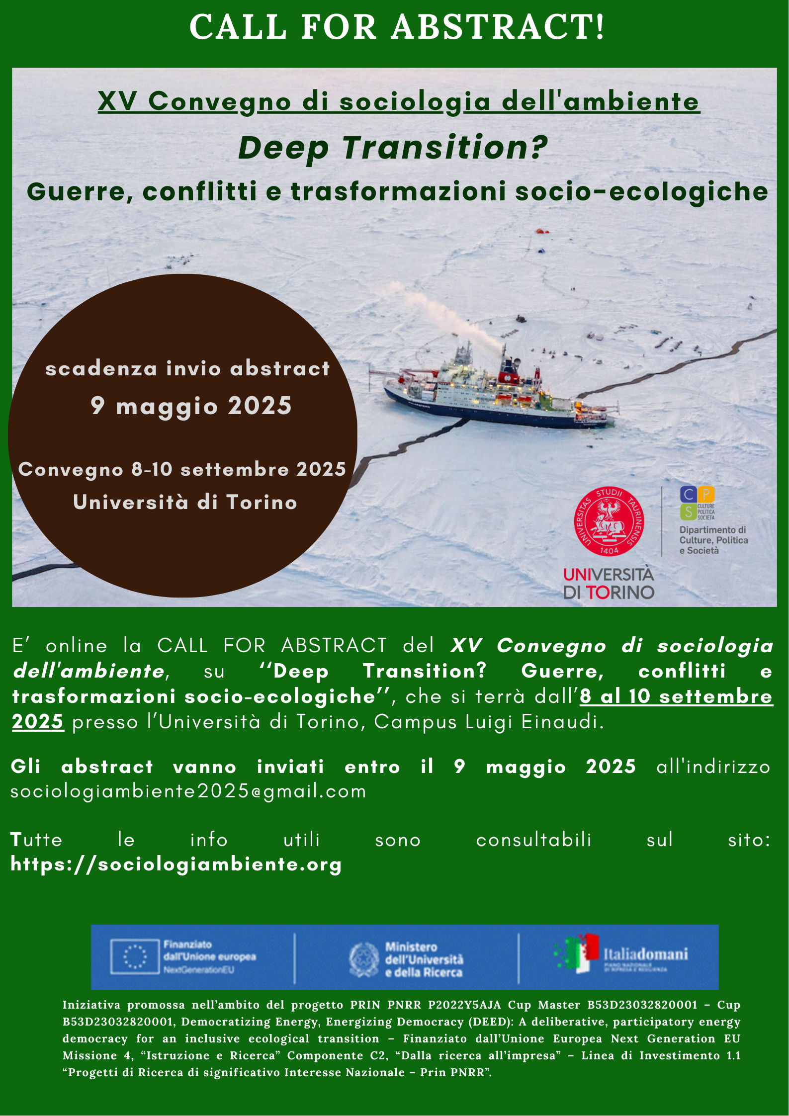 XV Convegno di Sociologia dell’Ambiente 2025: Deep Transition? Guerre, conflitti e trasformazioni socio-ecologiche. È aperta la Call for Abstracts per il XV Convegno di Sociologia dell’Ambiente 2025 dal titolo Deep Transition? Guerre, conflitti e trasformazioni…